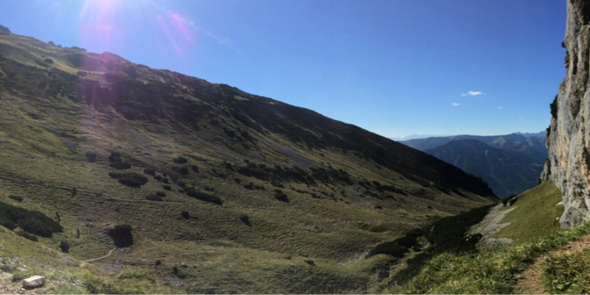 Nach kurzer Rast nehmen wir den Weg wieder auf, entlang am Hang über ebenen, schmalen Weg zum Westlichen Lamsenjoch. Immer mit freiem Blick in das Tal. Am Joch steigen wir auf der Rückseite wieder etwas ab in das Engtal, Richtung Pinsalm. Auf halbem Weg zweigt der Weg ab zum Pinssattel. Dieser ist schmal, schottrig und steil. Die Sonne brennt immer im Genick und auch hier ist der Blick frei in das Tal. Trittsicherheit und Schwindelfreiheit sind auch hier wieder ein muss. 150 Höhenmeter können echt anstrengend sein. Aber auch dieser Aufstieg endet irgendwann. Am Sattel ist der Blick frei auf die Gramai Hochalm. Zügigen Schrittes geht es abwärts über einen Mix aus Wiesen- und Schotterweg.