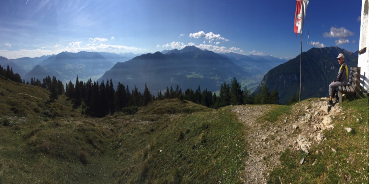 Das Wetter war wieder fantastisch. 9:30 Uhr starteten wir von Eben, Kirche St. Notburga. Durch den Wald steigt der Weg stetig, in vielen Kehren, steil an. Das erste Ziel ist die Astenau Alpe auf 1482m. Damit haben wir schon ca. 500 Höhenmeter geschafft. Bei einem Radler ruhen wir erstmal aus und beraten, ob wir wirklich den Aufstieg bis zur Spitze angehen wollen. Von der Alm hat man einen wunderschönen weiten Blick nach Jenbach und in das Inntal Richtung westlich nach Schwaz und östlich nach Kramsach. Sogar den Gletscher im Stubaital, unser vorheriger Wanderurlaub, sind gut zu erkennen. Wunderbar und einfach schön!
