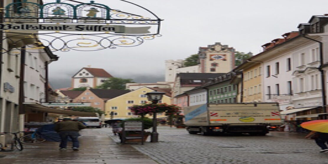 Das Wetter und die Erschöpfung der gestrigen Wanderung bewegt uns den Tag für einen Ausflug nach Füssen zu nutzen. Über Grän geht es Richtung Füssen. Schnell wird uns wieder klar, Österreich und Idien haben eine Gemeinsamkeit. Kühe sind hier nicht heilig, aber in bestimmten Gebieten Narrenfreiheit. Da hilft nur Geduld, wenn die Rindviecher zu dritt auf der Landstrasse stehen. Dann ganz knapp am Auto vorbeilaufen und hoffen das sie sie sich nicht an der Karosserie schubbeln. Ist trotzdem ein lustiges Schauspiel.