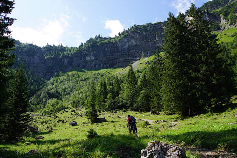 Zügig nehmen wir die erste Etappe, zum Trauaplsee, unter die Wanderschuhe. Durch Wald und Wiese geht es stetig Bergauf. Schweißtreibend!