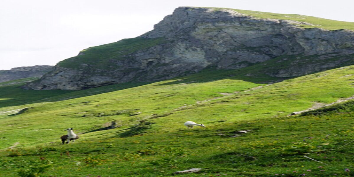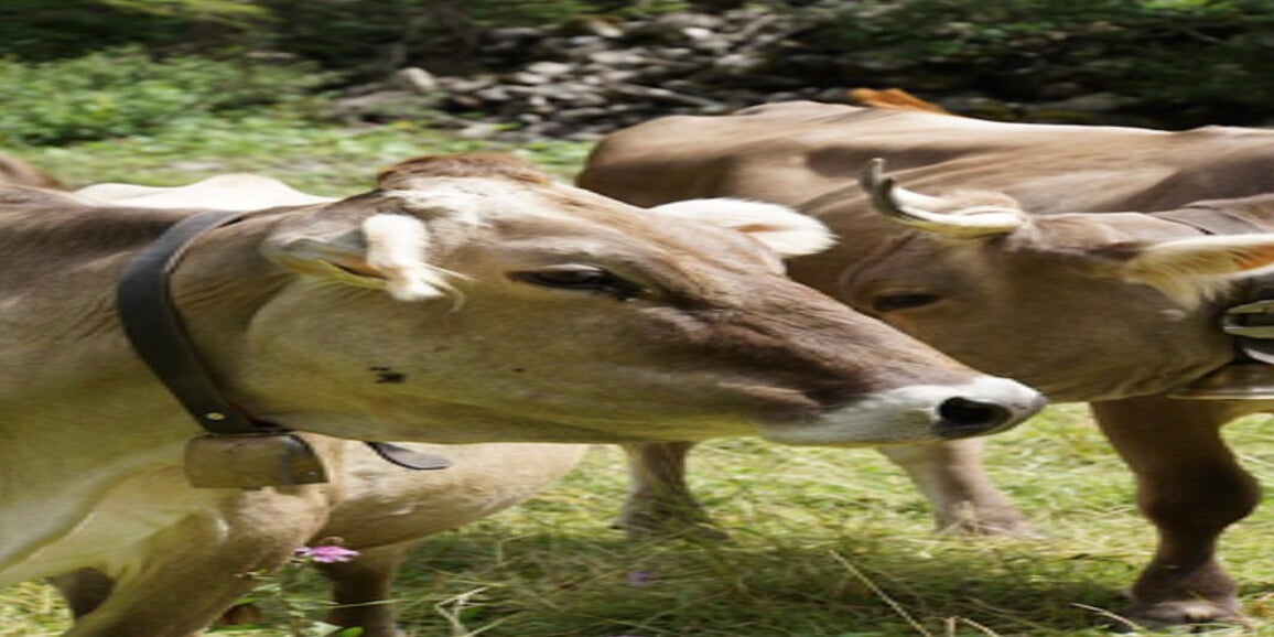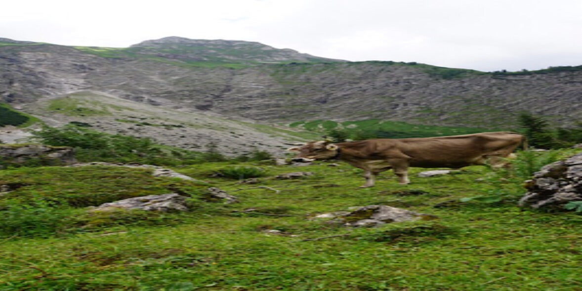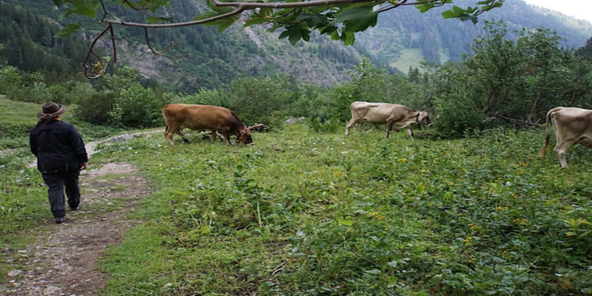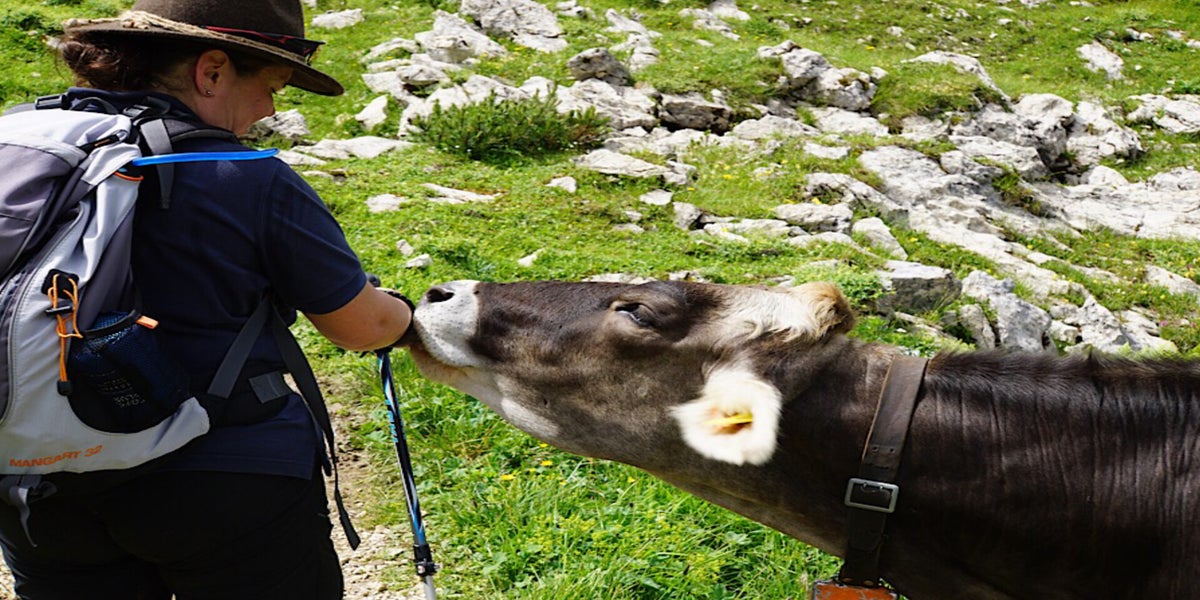 Nach der wichtigen Erholungspause geht es weiter bergab. Ein letzter Gruss von der Alpe, von einem der vielen Tiere auf der Alpe.