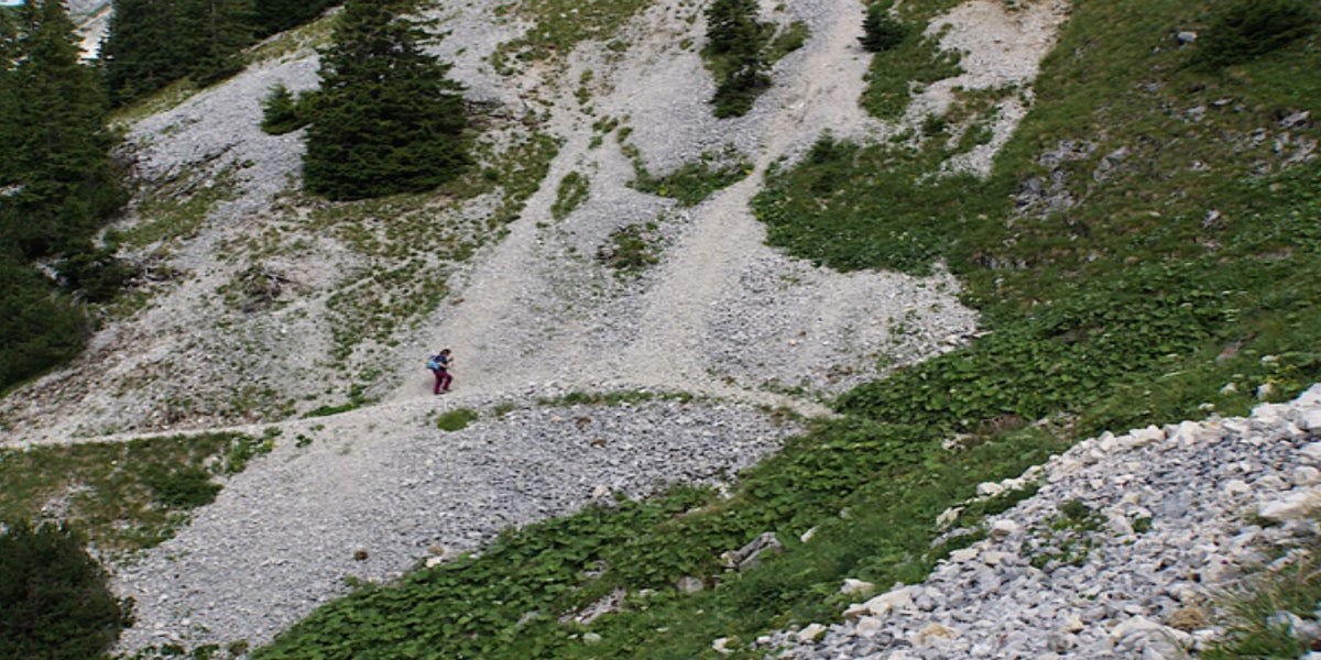 Allmählich ist der Großteil der Urlauber wach und stürmen den Berg und die Hütte. Zeit aufzubrechen zur Bergstation der Gondelbahn Füssener Jöchel. Wieder geht es abwechselnd auf und ab unterhalb des Brentenjoch entlang. Da kommt es wieder zu einer kleinen tierischen Begegnung.