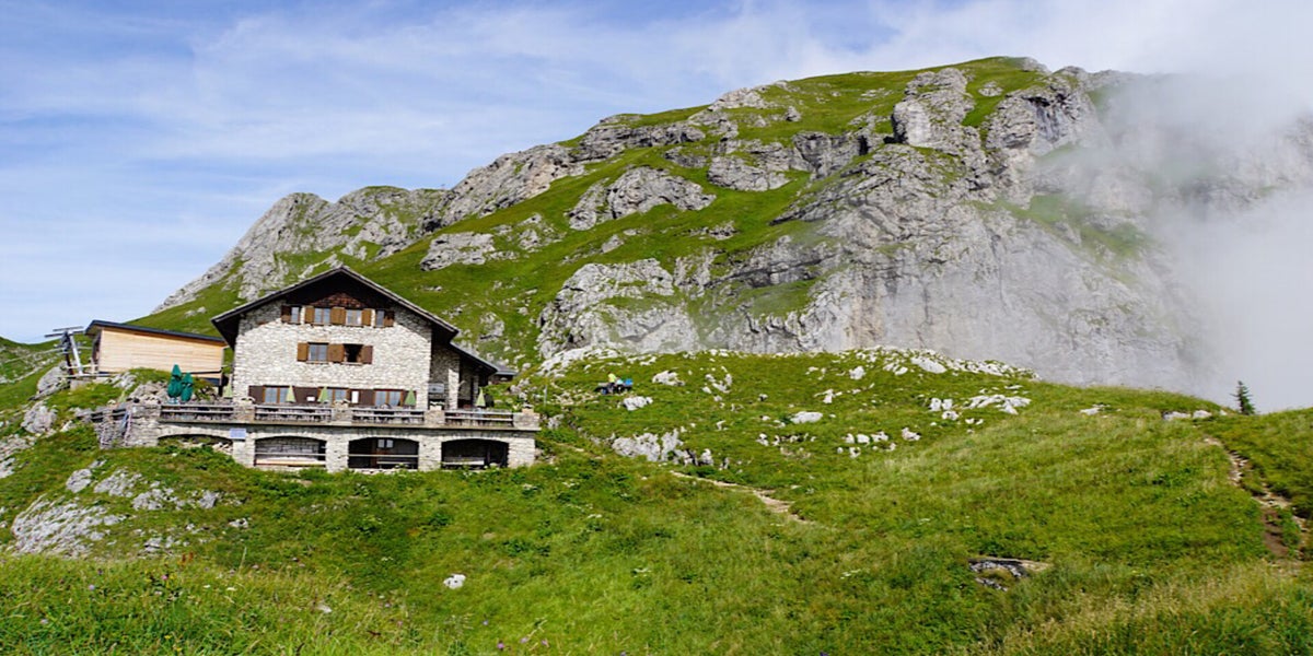 Da kommt die Füssener Hütte auch schon Blick in der Ferne.