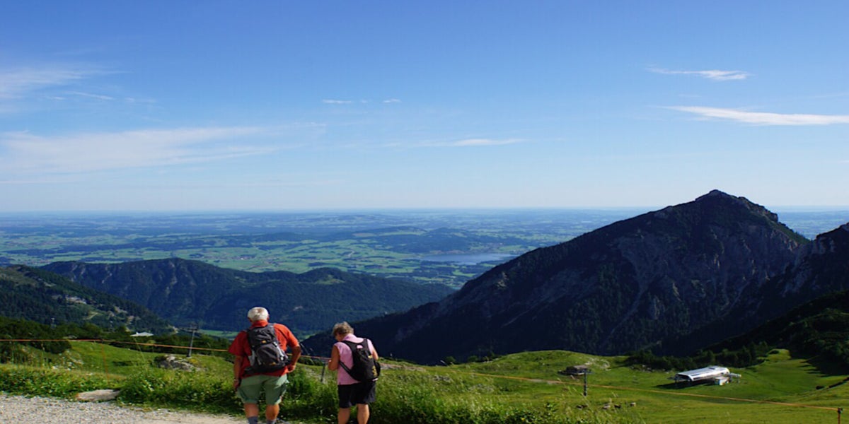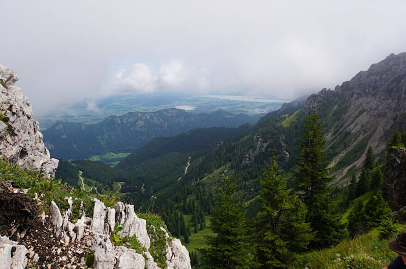 Nach einer wohlverdienten Pause mit Radler und ein paar Würschtl auf der Hütte geht es weiter. Da haben sich die Wolken Richtung Norden mal kurz verzogen. Schon ist der Blick frei Richtung Foggensee und Füssen.