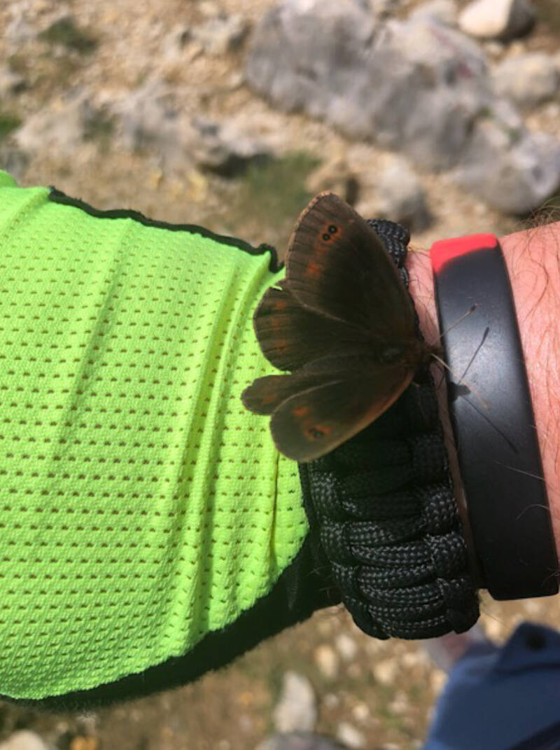 Dieser tierische Gast blieb, trotz Fortsetzung unserer Wanderung, auf der Hand sitzen für die nächsten Minuten. Beim Blick zurück ist es erstaunlich, was wir schon geschafft haben.