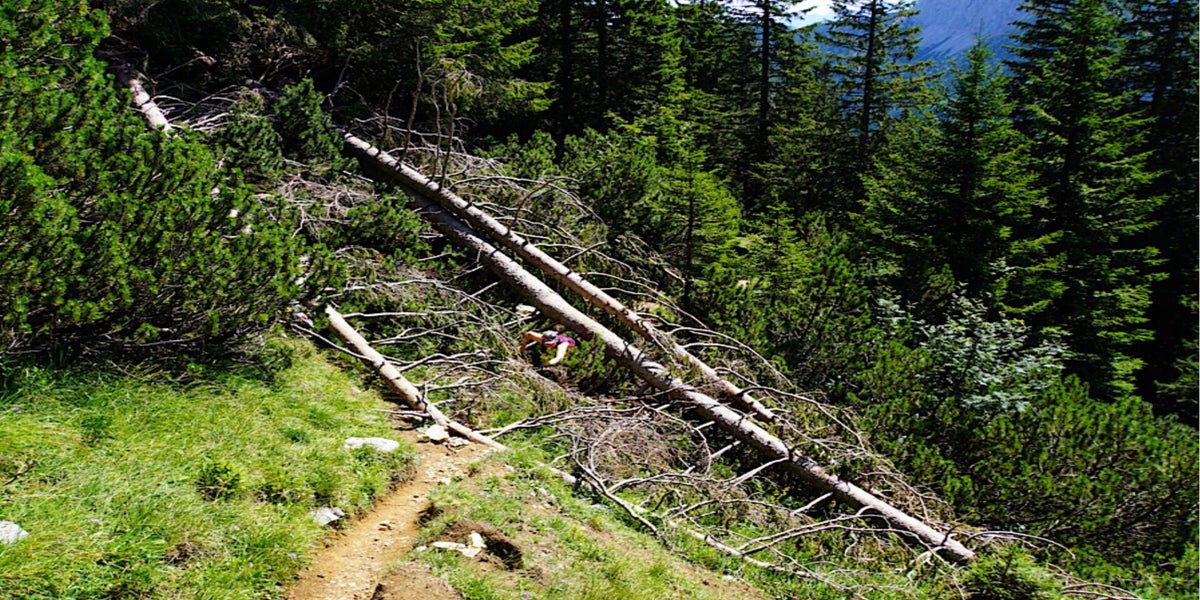 Nun geht es wieder steil bergan zur Vilser Scharte. Die Sonne steht auch schon hoch und es weht kein Lüftchen. Ein schweißtreibender Aufstieg. Nun hält der Weg auch noch Überraschungen parat. Einige umgestürzte Bäume blockieren den Weg. Ein alter, unberäumter Windbruch. Da bleibt uns nichts anderes übrig und die Herausforderung zu meistern.