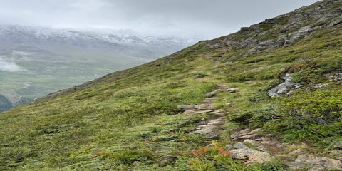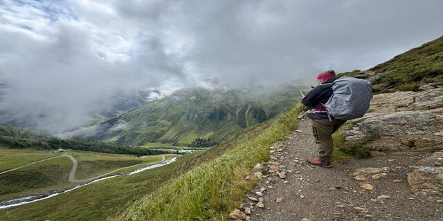 Von nun an führt der Weg kontinuierlicher bergab. Schmaler Bergpfad. In kürzester Zeit wechselte dazu das Wetter von Schneeregen, Sonne, Regen, Graupel und wieder kurze Sonnenlöcher. Das machte die Wahl der richtigen Kleidung schwierig.