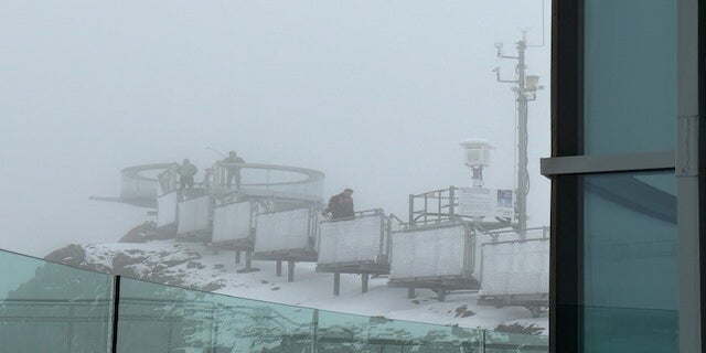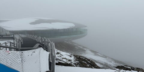 Man konnte schon beim Essen spüren, dass die ungewohnte Höhe, dem Körper und auch dem Gleichgewicht, zu schaffen machte. Als wir fertig sind, versuchen wir noch die geringe Aussicht und die ungewöhnliche Landschaft zu geniessen. Bei minus 1 Grad besuchten wir die Plattform, von der man aus einen, wahrscheinlich, fantastischen 360 Grad Blick auf die Alpen bietet. Hin und wieder riss der Himmel ein wenig auf. Sogar eine Schneeballschlacht war drin, im Hochsommer.